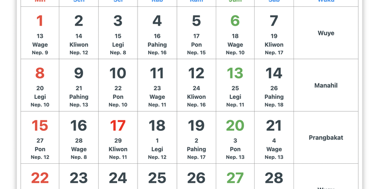 Kalender Jawa Februari 2026 adalah panduan penting bagi masyarakat Jawa dalam menjalani berbagai kegiatan sehari-hari, terutama yang berkaitan dengan tradisi Jawa. Dalam kalender ini, terdapat informasi lengkap mengenai pasaran, weton, dan wuku. Pasaran Jawa terdiri dari lima siklus utama, yaitu Legi, Pahing, Pon, Wage, dan Kliwon. Sementara weton adalah perhitungan tradisional yang menggabungkan hari (dina) dan pasaran dalam penanggalan Jawa. Wuku, di sisi lain, merupakan siklus tujuh hari yang dimulai dari Ahad (Minggu) dan berakhir pada Setu (Sabtu).