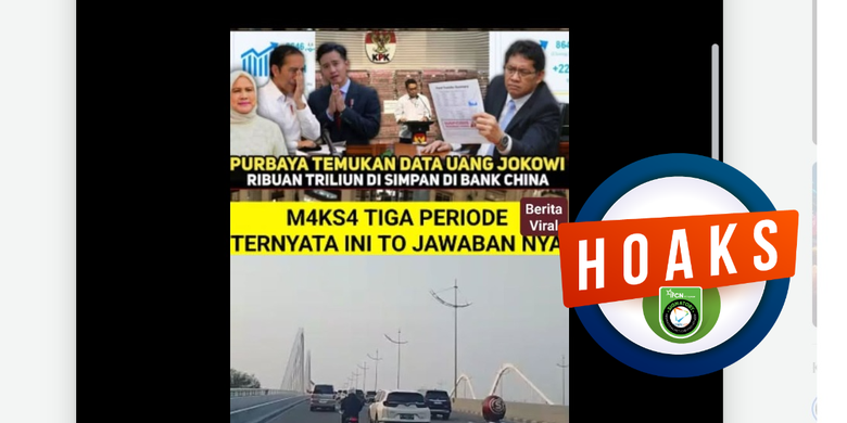 Pada pertengahan Januari 2026, Menteri Keuangan Purbaya Yudhi Sadewa disebut telah menemukan data adanya uang milik mantan presiden Joko Widodo di bank asal China. Namun, tidak dijelaskan bank mana yang digunakan Jokowi untuk menyimpan uang tersebut. Purbaya mengklaim menemukan jumlah uang yang mencapai ribuan triliun setelah melakukan analisis transaksi keuangan lintas perbankan internasional. Meskipun demikian, narasi dalam unggahan tersebut ternyata menyampaikan informasi yang keliru. Konten tersebut merupakan hoaks dan perlu diluruskan. Foto yang digunakan sebenarnya adalah momen saat Komisi Pemberantasan Korupsi menunjukkan barang bukti dalam sebuah kasus korupsi investasi fiktif di PT Taspen (Persero).